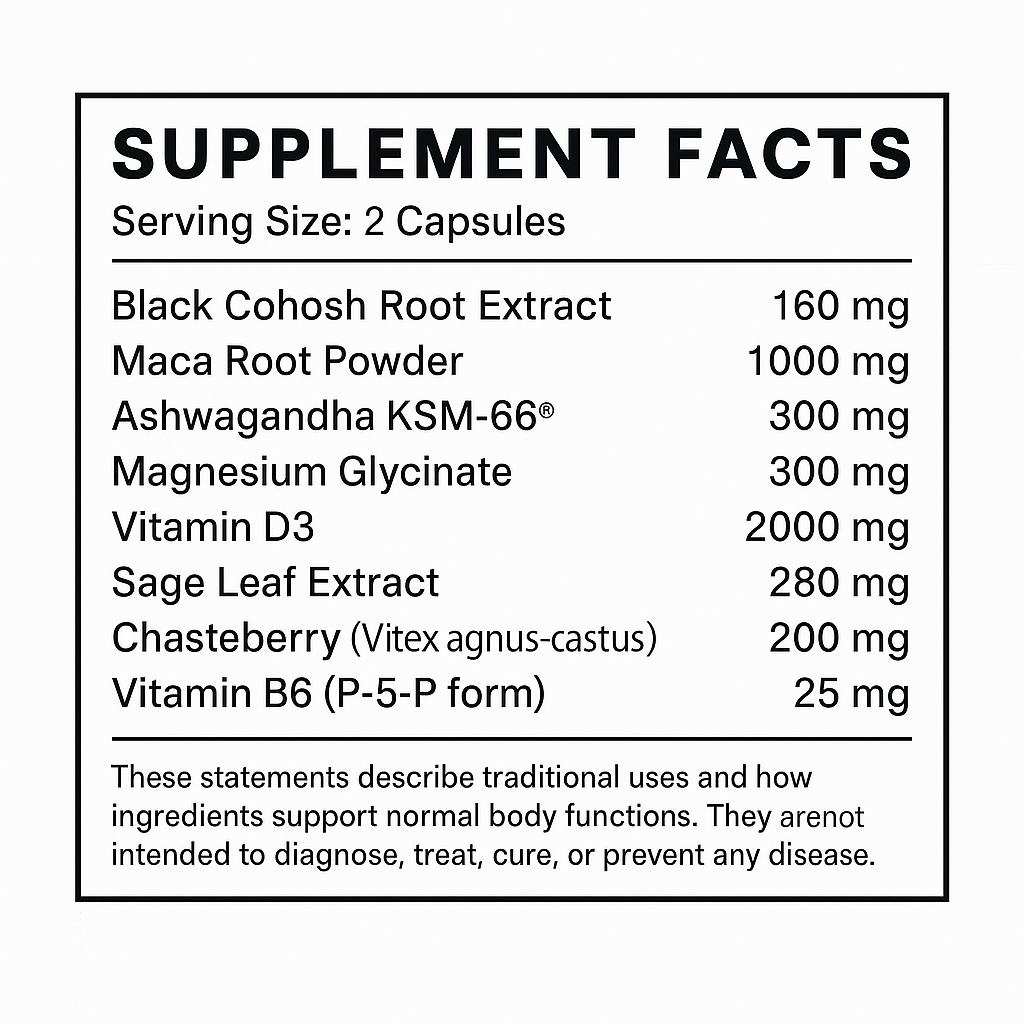Formulated with botanicals traditionally used to support women during hormonal changes, including Black Cohosh and Chasteberry that have been studied for their role in women's wellness during perimenopause and menopause.
